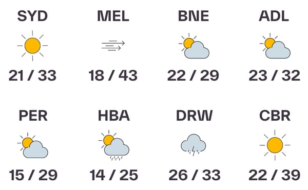 The ongoing heatwave is causing a stack of fire danger warnings across the country today, but particularly in Victoria, where the state’s emergency services are warning of the worst conditions “since black summer in 2019-20”. Authorities are especially worried about the Longwood area of the state, which has been dealing with a volatile fire for the last 24 hours. Late last night, Premier Jacinta Allan told Victorians that “if the forecasts are right, tomorrow will be catastrophic” and told Victorians to take action immediately. While Melbourne’s 43C is the highest forecast max of the capital cities today, it’ll be Sydney’s turn tomorrow, with extreme fire danger projected across New South Wales and the ACT. Stay safe/hydrated…